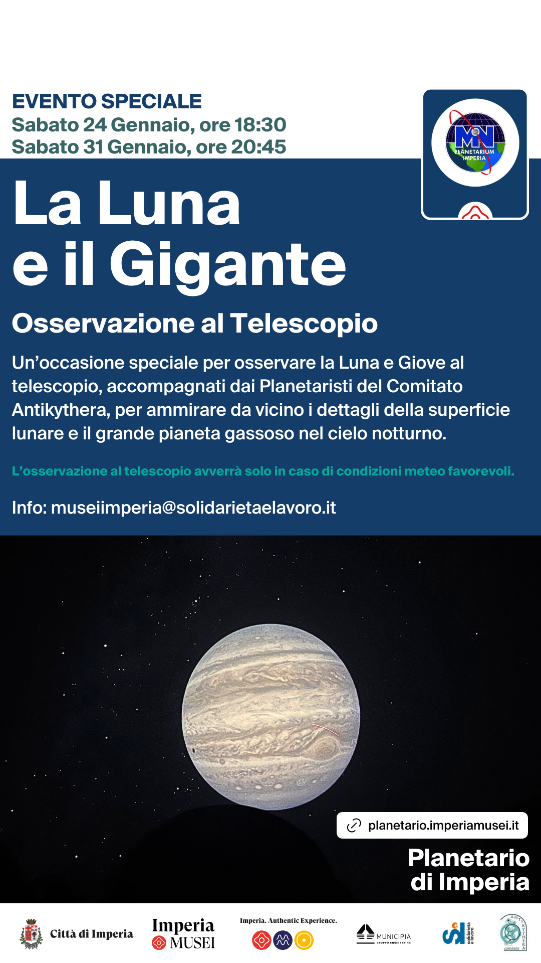 il Planetario di Imperia ospiterà l'evento speciale "La Luna e il Gigante": un’occasione speciale per osservare la Luna e Giove al telescopio, accompagnati dai Planetaristi del Comitato Antikythera, per ammirare da vicino i dettagli della superficie lunare e il grande pianeta gassoso nel cielo notturno.